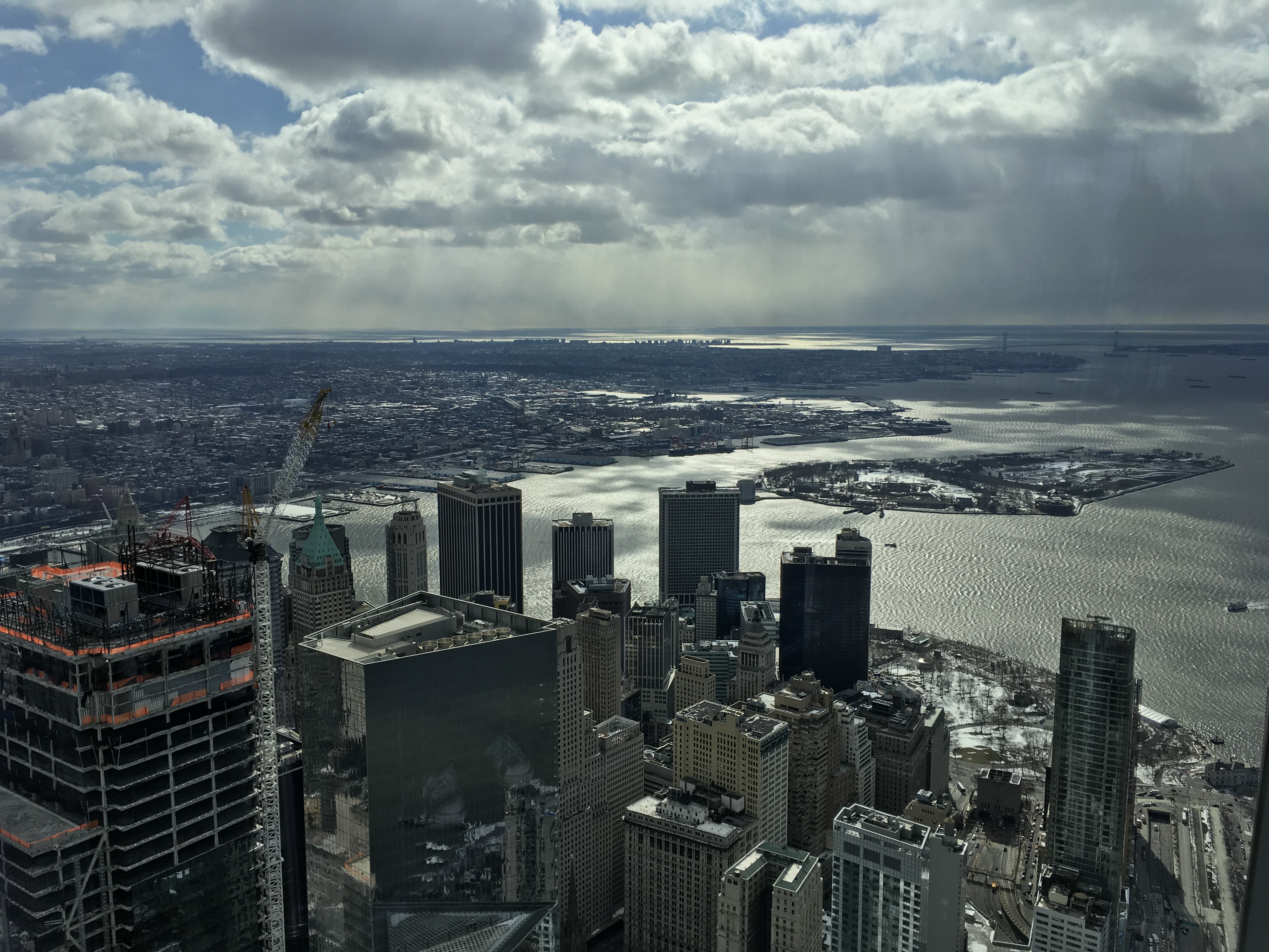 Wir verbrachten den halben Tag an diesem Platz und unsere Kameras liefen heiß. Wir snackten dort – natürlich viel zu teuer und vermutlich auch nur, um später einmal stolz behaupten zu können, an diesem exponierten Ort Kaffee getrunken zu haben. Es ist ein wirklich ein unglaubliches Gebäude: Modern, schlank und elegant zugleich. Dessen Statur wirkt verdreht oder an dem Umrisskanten abgeschnitten. Ich empfinde die Architektur als sehr gelungen, zeitgemäß und zeitlos. Das Wetter war bei dieser Inszenierung jedoch nicht uneingeschränkt heiter. Im Gegenteil neben der Sonne zogen vom heftigen Wind getrieben dichte Wolken am Himmel vorüber und zeichneten mit ihren Lücken schöne Sonnenmuster auf Hudson- und East River. Dabei tauchten sie auch Liberty und Ellis Island von Zeit zu Zeit in bedeutsames Licht. Vieles ist ist von hier sehr gut zu erkennen: Empire State Building, Chrysler Building, Times Square, aber auch die Brooklyn Bridge und die Freiheitsstatue. Natürlich versäumte einer der emsigen Mitarbeiter nicht, mir ein ein Info iPad kostenpflichtig in die Hand zu drücken, die uns per Augmented Reality App die jeweiligen Infos zu wichtigsten der 50.000 sichtbaren Bauwerke näherbrachte, die von hier oben zu sehen waren.