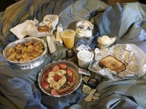 „Hunger!?“ sagts von links, was heißt Tanja ist auch ins wache Leben zurückgekehrt. Keine Lust aufzustehen beschlossen wir per Room Service Frühstück vom George’s in New York Downtown bringen zu lassen.Wir bekommen die verheißungsvolle Tüte und breiten die landestypischen Kostbarkeiten auf unserer Bettdecke aus. Der Tag kann beginnen.