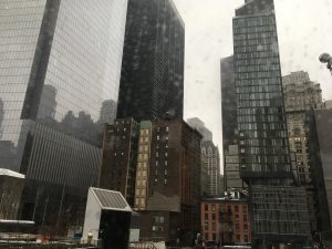 Das Zimmer ist im dritten Stockwerk und der Blick aus dem Fenster zeigt – als ich den Vorhang beseite schiebe – nicht die Aussicht der booking.com Seiten, sondern eine vom Schneeregen begossene Baustelle. Diese vermag ich aber, zumindest solange das Fenster ungeöffnet bleibt, nicht zu hören. Ich leg mich wieder hin… so früh aufzustehen erscheint im Urlaub sowieso irgendwie unangebracht. Das mit der Baustelle ist nicht so schlimm; in unserer Häuserschlucht zieht es den Blick ohnehin sofort nach oben. Ich sehe ein altes Haus, welches ich mit seinen 12 Stockwerken in direkter Nachbarschaft wesentlich größerer Gebäudegeschwister kaum mehr als hohes Haus oder gar Hochhaus bezeichnen würde. Es steht im direkten Kontrast zu eben diesen, die jenes bräunliche Gebäude so mickrig erscheinen lassen: Armes Ding! In einem der beiden großen an den Wolken kratzenden Glasfassaden spiegeln sich wiederum andere in den Himmel ragende Bauwerke. Das obere Ende der beiden gegenüberliegenden Imposanzen ist aus unserem Hotelfenster nicht einmal zu sehen. Nun geht es mir so wie wahrscheinlich vielen vor mir auch, die zum ersten Mal diese Stadt besucht haben. Ich höre mich innerlich sagen: Wow, wir sind in New York!