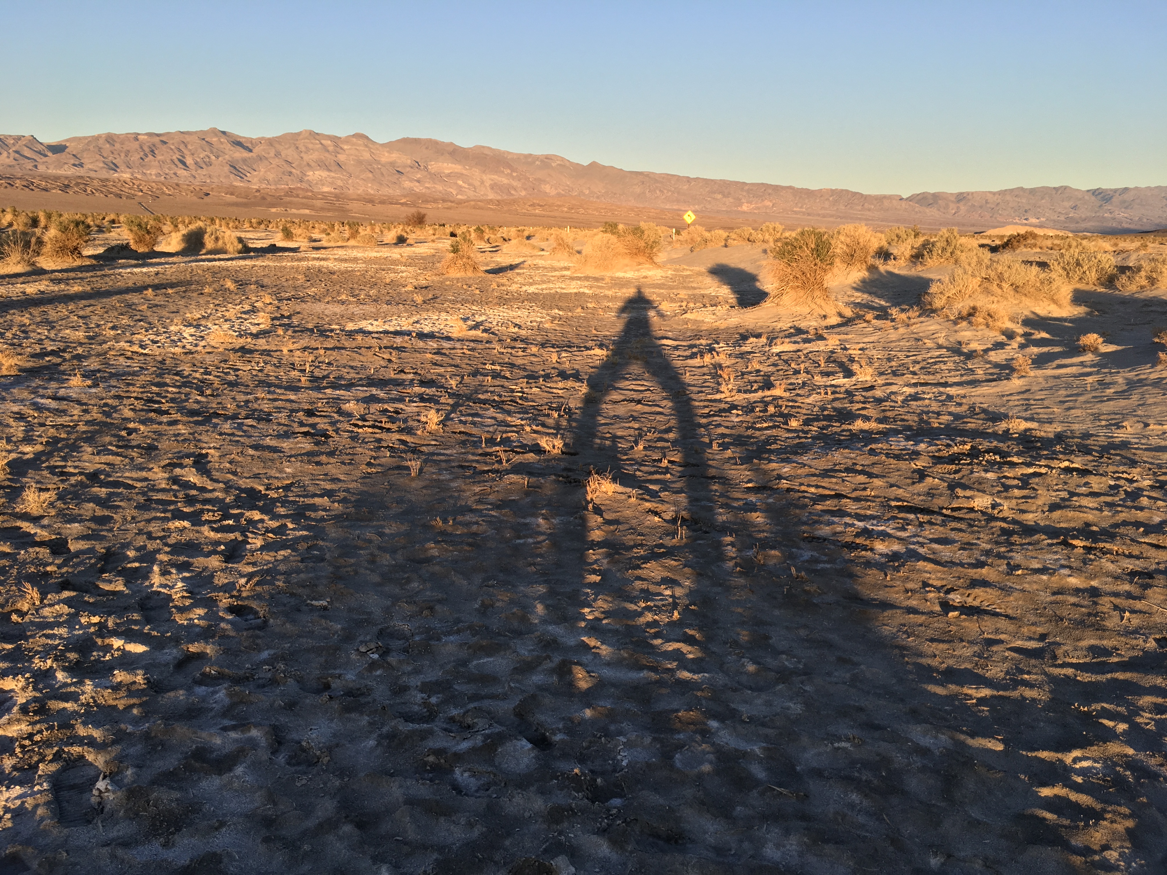 Das Tal ist von hohen Gebirgszügen umschlossen. Es liegt 86 m unter dem Meeresspiegel. Das heißt, hat es Wasser tatsächlich bis in dieses Tal geschafft ist es zum Verdunsten verdammt, da es auf dem Weg zum Meer nunmal nicht bergauf fließen kann. Wasser gibt es hier übrigens häufig nach jedem Winter, da die Gipfel der Berge die wir beim Einfahren ins Tal sehen nahezu alle Schnee auf ihren Kämmen tragen. Setzt die Schneeschmelze ein kommt es auch im Death Valley häufig zu Überschwemmungen. Auch wir sehen aufgestellte Hinweisschilder, dass manche Routen aufgrund von Überflutungen nicht befahrbar sind.