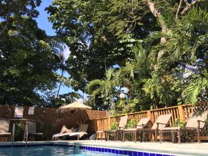 Gestärkt reiten wir weiter zum Island City House und finden – nachdem wir dem Müllwagen für einige Minuten gefolgt sind – einen Non-Residental-Parkplatz direkt vor der Tür. Wir melden uns bei der Ankunft erneut an der Rezeption zurück. Ich hatte meine Regenjacke im Schrank des Zimmers vergessen. Ein Hoch auf das fleissige Zimmermädchen. Wir packen noch nicht, sondern werfen uns in Badeklamotten und trotten zum Pool, an dem wieder einmal kaum etwas los ist. Wir finden eine schöne Liege für zwei Personen mit Schirm, der einen vorm Verbruzzeln in der Sonne schützt. Wir ziehen ein paar Runden im lauwarmen Wasser, genießen die Sonne und chillen bei leiser südamerikanischer Musik.