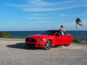 That is a beautiful place. I can just picture the ocean with its white sand beaches and clear turkois blue water all around and that cool red Mustang with the two of you fits right into the landscape. Fantastic!