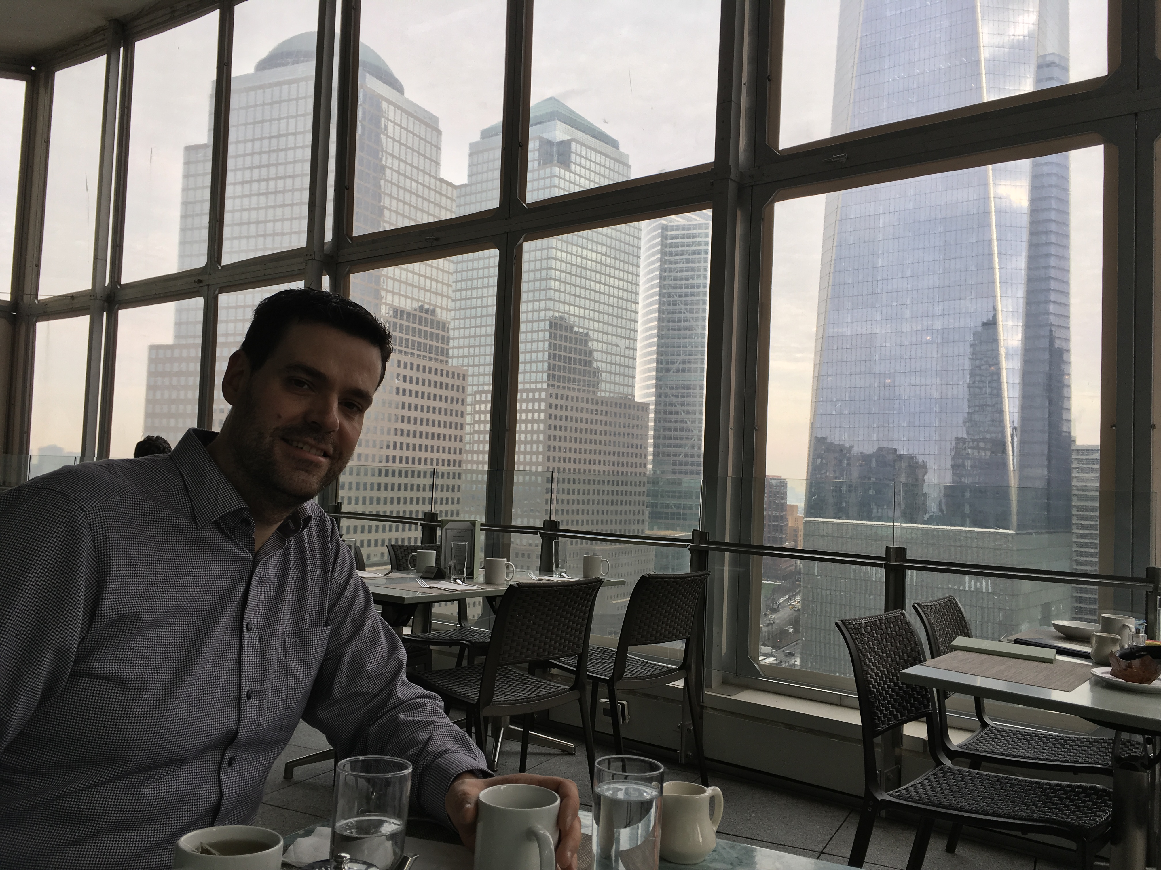 Es ist so wie erhofft: Als Tanja und ich aufwachen sind wir beide gleichermaßen erholt. Es war wohl das beste für Tanja, gestern den Tag im Bett zu bleiben. Dennoch war es nicht leicht für sie bei der Dursicht meiner Fotos zu sehen, wie schön der gestrige Tag – gemeinsam erlebt – hätte werden können. Naja das war gestern und auf unserer Reise liegt ja noch so einiges vor uns, besucht und erlebt werden zu wollen. Außerdem hätte es sie ja auch viel schlimmer treffen können und wäre dann viel länger ausgefallen. So schauen wir erst einmal auf die Uhr und dann in die Frühstückskarte. Tanja fühlt sich zwar noch etwas geschwächt, aber ihr Hunger auf ein Continental Breakfast ist zurückgekehrt: Ein gutes Zeichen. Und ein guter Grund an unserem letzten Morgen im Club Quarters in New York den Kaffee – bzw. den magenschonenden Kamillentee – auf der Dachterrasse des Hotels im 20. Stock zu genießen. Es fühlt sich kurz darauf schon fast etwas VIP-mäßig an, direkt vor einer Glaswand mit Blick auf das 9/11 Memorial und das 1-WTC Platz zu nehmen. Hier gibt es eigentlich nicht viele Plätze, aber trotzdem ist auch hier wieder recht wenig los. Tanja und ich können uns fast einen Platz aussuchen. Wände und Dach der Terrasse sehen so aus als stehen diese hier wohl nur temporär während des Winters. Wände und Dach der Terrasse sehen so aus als stehen diese hier wohl nur temporär während des Winters. Das heißt im Sommer kann man den Morgen hier komplett im Freien verbringen. Jetzt offeriert uns zumindest eine unabgeschlossene Tür den Schritt nach draußen auf ein kleines Teilstück der Terrasse. Wir gestatten uns diesen Besuch an erstaunlich guter und frischer Luft und natürlich ein Frühstück auf welches wir uns ja so gefreut hatten. Durch stetiges Rumgeknippse gaben wir natürlich auch hier schnell unsere Touri-Identität preis was uns aber – ebenfalls wie immer – völlig egal ist. Zu Kräften gekommen besprechen wir unsere Planungen. „Ich möchte unbedingt zur Eisbahn am Rockefeller Center“, meint Tanja und damit wäre TOP 1 des Tages geklärt.