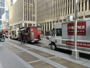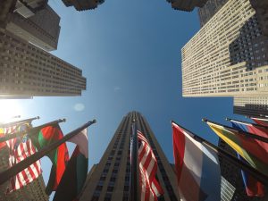 Der vergnügt spielende junge Geiger ist nach etwa einer aminute fertig und verneigt sich ordentlich. Verblüfft stellten wir fest, dass er hierfür von einigen – die zuvor so unbeteiligt wirkten – mindestens fünf Dollar in seiner Kappe zusammensammeln konnte. Der Geiger stieg aus zum nächsten Publikum aus und wir liefen an die Erdoberfläche. Als wir dort ankommen werden wir wieder von strahlendem Sonnenschein empfangen. Auf unserem Weg durch die riesigen Gebäude namhafter Banken und bekannter Unternehmen sehen wir immer wieder Food Trucks mit Imbiss Spezialitäten jeder Küche vor ihren Eingängen stehen. Vermutlich warten sie dort, um der Belegschaft eine schmackhafte Alternative zum Kantinenessen zu bieten, bevor sie abends die Straße wieder räumen. Nach einer Zeit sehen wir ganz viele Fahnen vor einem nicht ganz neuen aber dafür sehr hohen Gebäude. Dass müsste das Rockefeller Center sein. Ein paar Schritte weiter bestätigte sich die Vermutung schnell: Eis einer Eisfläche auf der an Weihnachten Schlittschuhläufer vor einem großen bunten Weihnachtsbaum symbolträchtig ihre Runden ziehen. Gerade wird das Eis erneuert und wir nutzen die Zeit bis das nächste Fotomotiv fertig ist, uns hinzusetzen, um dieses imposante Bild auf uns wirken zu lassen.