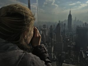 Radio City, hier war Amerikas innovativstes Radio zu Hause und auch heute beheimatet sie das National Broadcasting Center. Von hier wird die bekannte today-Show gesendet und Jimmy Fallon geht in dieses Gebäude für seine Late-Night täglich zur Arbeit. Diesem Gebäude wollen wir nun auf sein Dach steigen. Auf dem Weg zum ‚Top of the Rock‘ werden wir plötzlich von allen Seiten aus instruiert bzw. darüber informiert, dass wir das Set zu räumen hätten. Wir sind offensichtlich mitten in irgendwelche Dreharbeiten gestolpert, welches Arri-Equipment, Dolly und jede Menge Scheinwerfer schnell verdeutlichen. Außer „Action!“ ist nicht viel zu hören. Die Schauspieler waren zumindest mir nicht bekannt und die gespielte Kuss-Szene auf offener Straße fand ich irgendwie kitschig. Da wir sowieso wieder mit hektischen „Keep going!“-Rufen weg geschimpft wurden zogen wir weiter zum nahegelegenem Eingang des TotR. Fünf Minuten später ging dann auch schon wieder ein Aufzug mit uns an Bord nach oben. Und wieder hat man sich bei dem Lift etwas Originelles ausgedacht. Das Dach des Aufzugs ist transparent und der Aufzugschacht mit bunten LED-Bändern versehen. So konnten wir beim Spurt nach oben sehen, wie schnell wir dem Dach des Rockefeller Centers entgegeneilten.