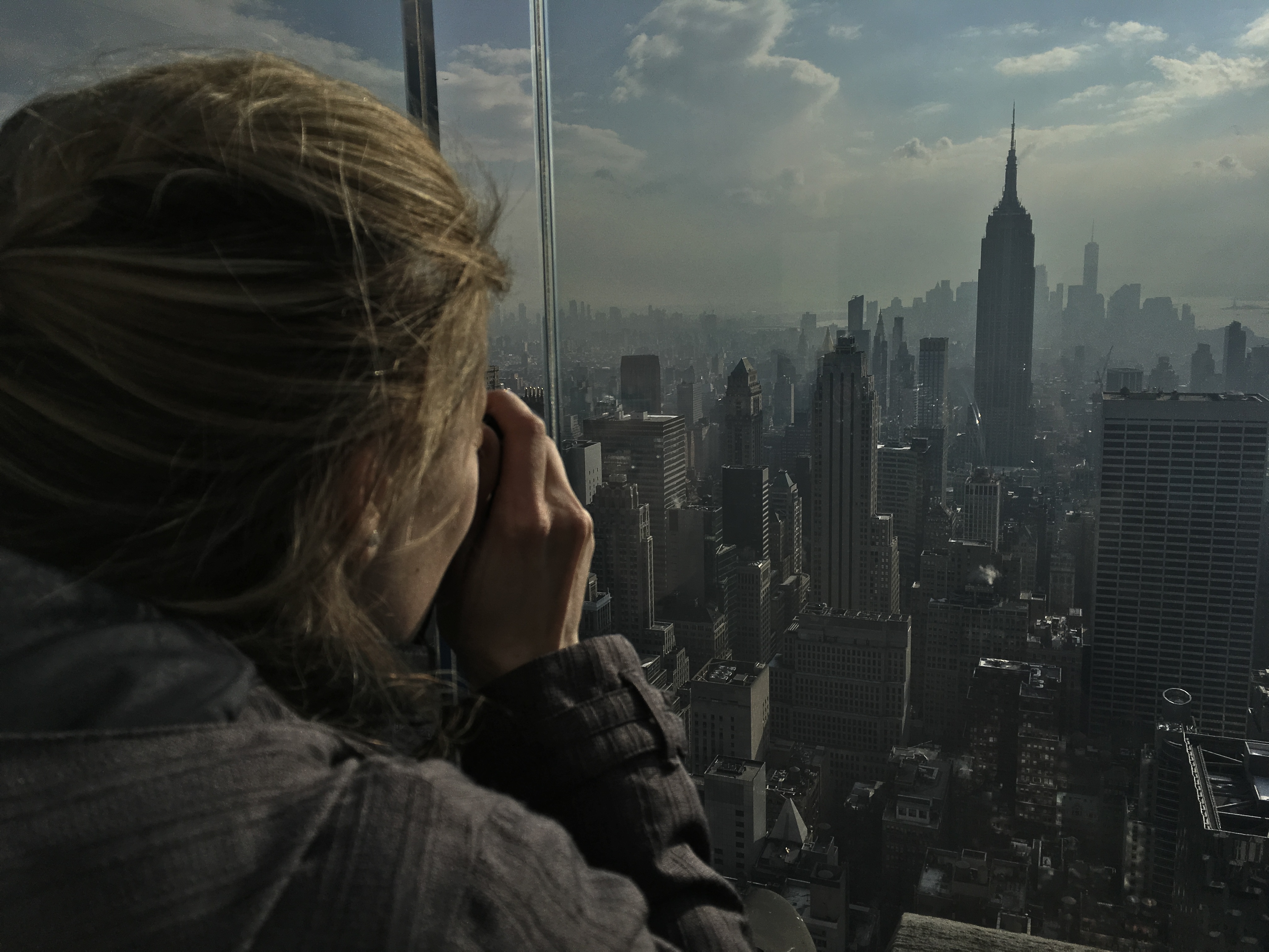 70. Stock: Endstation. Schon beim Heraustreten aus dem Aufzug spürten wir sofort, dass der Ausblick von hier – auch wenn noch etwa 30 Stockwerke fehlten – mindestens so beeindruckend ist, wie vom 1-WTC. Selbiges ist von hier aus an der Downtown Südspitze gut zu erkennen. Ein beeindruckendes Bild auf welchem der Künstler nicht vergaß, dass Empire State Building als zentrales Motiv, in seine Mitte zu setzen. Sonne und Wolken liefern erneut ein Wechselspiel, um der prächtigen Szenerie sogar noch mehr Ausdruck zu verleihen. Wir machen viele Bilder, die so vor uns natürlich noch nie zuvor jemand gemacht haben wird. Auf dem obersten Floor versperren uns und dem Kameraobjektiv nicht einmal mehr Glasscheiben die Sicht auf die Stadt. Bevor es für Tanja und mich dann wieder effektvoll nach unten gehen sollte… ließen wir uns zuvor für ein paar Momente nieder, um das zu was wir gerade vor uns sehen bewusst in uns aufzunehmen.