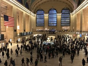 Wir peilen per U-Bahn die Grand Central Station an. Als wir unten in zunehmendem Menschengewusel aussteigen, kann man sich bei dem Stop an der nicht wirklich attraktiven Haltestelle kaum vorstellen, dass wir nur ein paar Minuten später in einem um so schöneren alten Gebäude des weltgrößten Bahnhofs unterwegs sein werden. Wir gehen zwei Treppen der Haupthalle hinauf und stehen damit automatisch mitten in Verkaufsflächige des hiesigen Apple Stores. So langsam wird es voll hier… nun hechten doch eilig die bereits von uns erwarteten Pendler an uns vorbei und eine Gruppe von Schild- und Bannerträgern formiert sich in der Mitte der Halle an der historischen Uhr, um gegen Trumps Dekret-Politik zu demonstrieren. Als Cineast schießen mir wieder Szenen aus Film und Fernsehen durch den Kopf und ich stelle mir vor, wie mir gleich Alex – der Löwe aus Madagascar – nach seiner Flucht aus dem Zoo mit den anderen Tieren seiner Gefolgschaft entgegenspringen wird.
