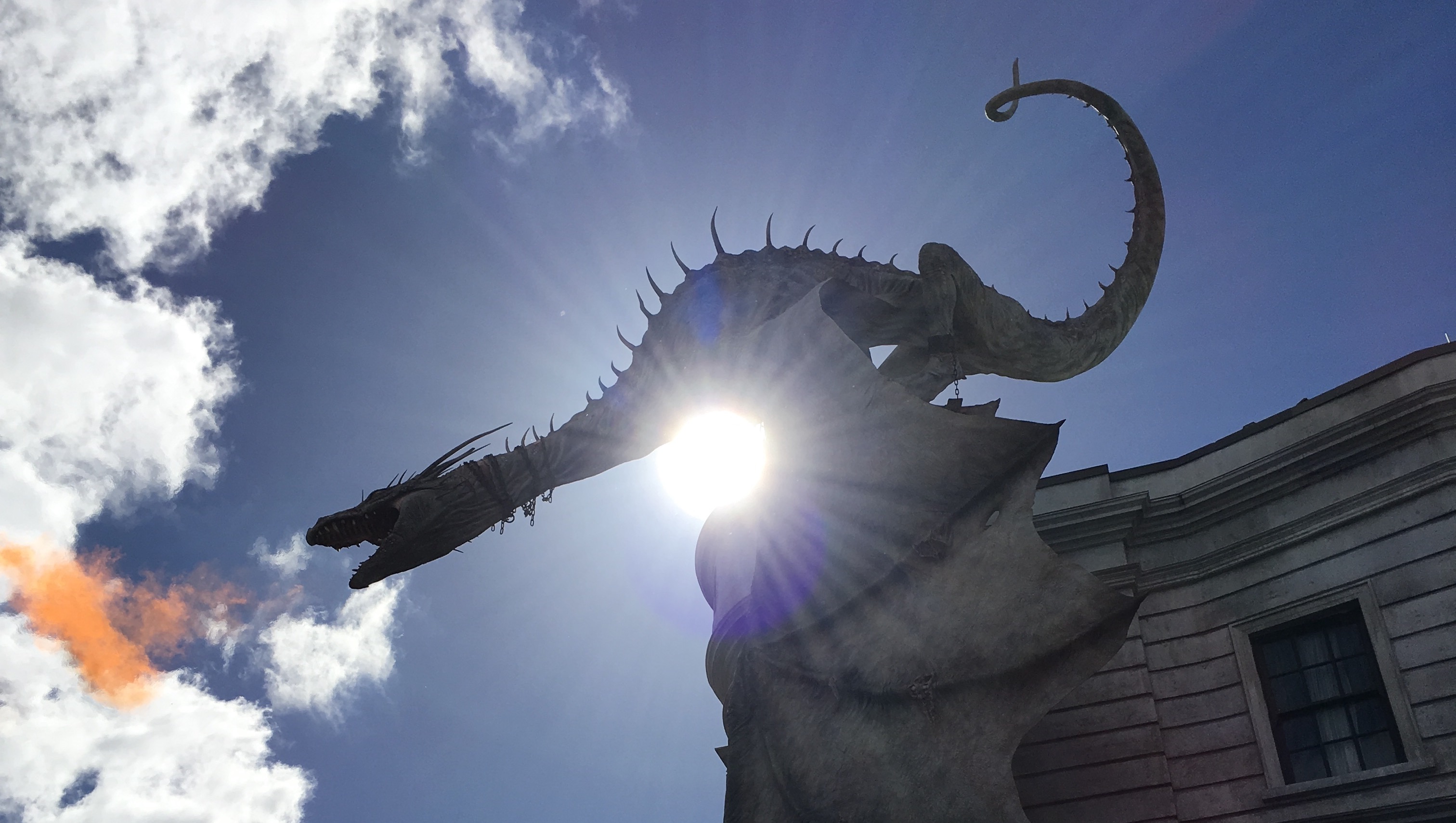 Wir beginnen mit den Minions und Shrek 4D Rides und besuchen dann die Diagon Alley in der Wizarding World des Harry Potter: Atmosphärisch der absolute Höhepunkt des Parks. Bei so viel Detailverliebtheit kommen auch eher gemäßigte Harry-Potter Fans auf ihre Kosten. Wir halten uns in dieser Welt eine ganze Weile auf, einfach weil es so schön ist, immer wieder neue Gassen, Winkel und Geschäfte dieser Welt zu erkunden. Kinder können mit ihrem natürlich käuflich zu erwerbenden Zauberstab Bewegungen ausführen, worauf in dieser Welt plötzlich irgendwo irgendetwas passiert. Wird der Stab richtig geführt geht zum Beispiel irgendwo plötzlich das Licht an oder es regnet unter einer Laterne. Die Kids fahren total darauf ab. Optisches Highlight ist ein riesengroßer Drache, der auf einem der Häuser sitzt und nach tiefem verheißungsvollen Grollen etwa alle 10 Minuten eine Feuerfontäne spukt. Ein klasse Effekt. Eine der drei mit Abstand besten Attraktionen befindet sich auch hier.