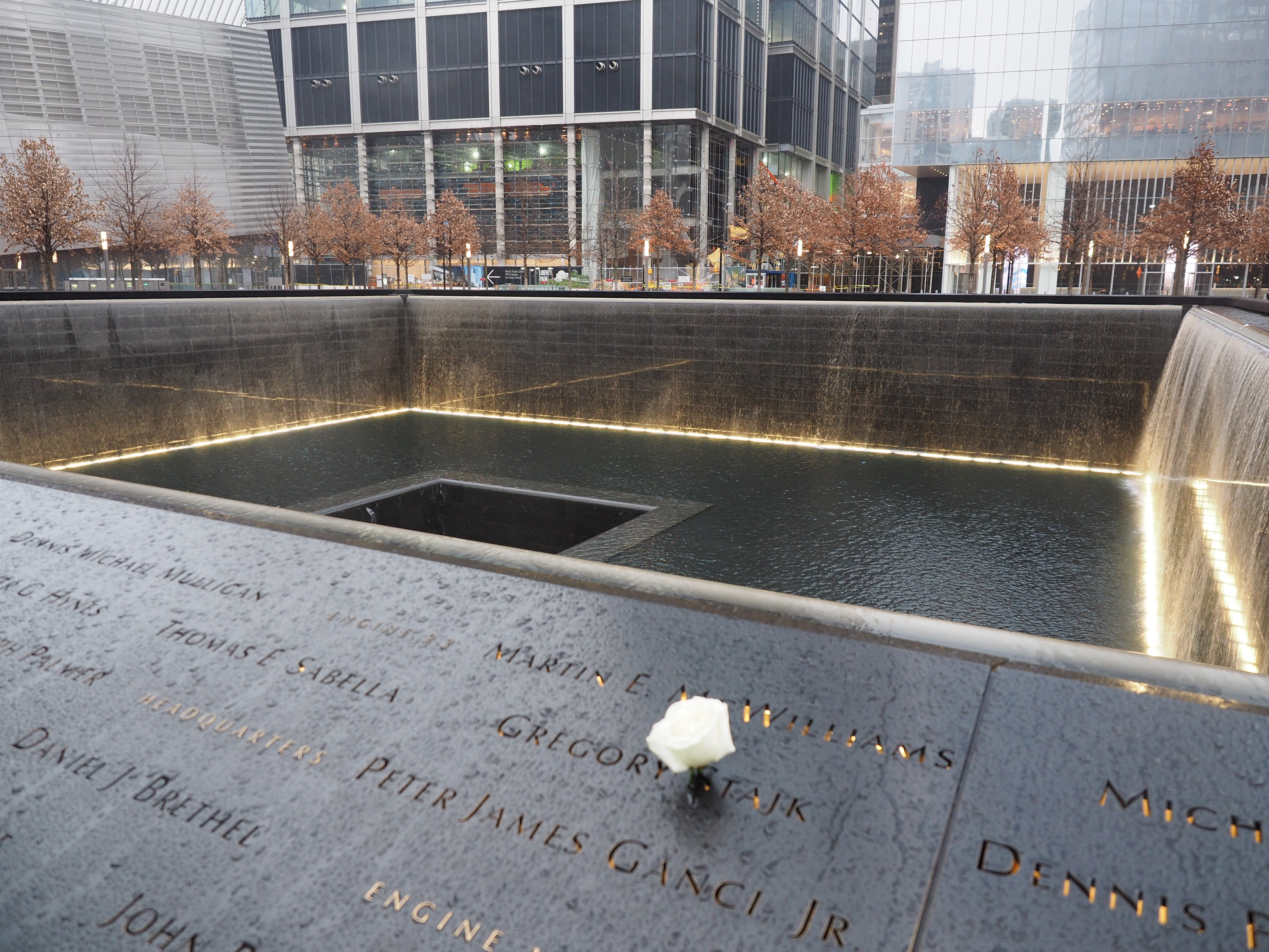 Wir machen uns auf zum Reflecting-Absence Pool des Südturms. Wir schauen hinunter auf die Fläche, die einst die Grundfläche des über 415m hohen Gebäudes darstellte. Es wird umrahmt von einem rundumlaufenden Wasserfall, welcher in Form von vier Wasserwänden 9m in die Tiefe stürzt. Es sind damit die größten von Menschen geschaffenen Wasserfälle in den USA. An einigen Stellen sind Blumen in die Namen der 2.983 verstorbenen Menschen gesteckt worden, die hier an nur einem einzigen Tag ihr Leben verloren haben. Uns fällt es nicht schwer darüber nachzudenken, was hier fehlt… unmöglich, dies nicht zu tun. Für mich wirken die großen Wasserbecken der einstigen Zwillingstürme wie zwei kräftige Fußabdrücke eines stolzen Menschen, den der Hass anderer dennoch zu Fall bringen vermochte. Die Gebäude drumherum scheinen dabei wie Zeitzeugen zu kondolieren. Doch nicht ganz… ein Gebäude fällt sofort deutlich auf. Natürlich tut es das, denn es ist das höchste hier: Das One World Trade Center. Es scheint die Antenne auf dem Dach stolz wie eine Fahne der Freiheit zu tragen und an die Stelle der Twin Towers treten zu wollen, es dann aus Andacht und Ehrfurcht jedoch nicht zu tut und kurz davor stehen bleibt. Gänsehaut rennt mir über den Körper, es sollte nicht das einzige Mal heute bleiben.