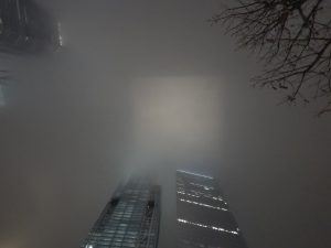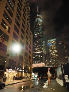 Wir gehen hinaus und stehen wieder direkt am Ort des Geschehens. Die Pool-Beleuchtung strahlt ein helles Viereck in die Wolken zwischen den Hochhäusern. Jetzt kommt der Hunger zurück. In den unterirdischen Räumen des Memorial Museums war daran scheinbar zuvor nicht zu denken. Wir folgen der nahegelegenem Tripadvisor-Empfehlung in Richtung Italien. Im Eataly essen wir etwas und reden über das gerade Erfahrene. Wir entschließen uns, zum Hotel zurückzukehren. Heute ist uns nicht mehr danach, diese Stadt bei Nacht zu erleben. Ein letzter Blick nach oben: Innerhalb kurzer Zeit reißt der Himmel plötzlich auf. Die Wolken scheinen wie durch einen Sog nach oben abzuziehen. Uns wird klar, dass wenn wir hier in diesem Hotel den Morgen des 11.September 2001 erlebt hätten, wir sehr viel Glück hätten haben müssen bis zum Abend überlebt zu haben. Innerhalb weniger Minuten wird der Himmel ganz klar und legen das One World Trade Center vor dem Hintergrund eines Sternenhimmels frei. Gänsehaut… das letzte Mal für diesen Tag.