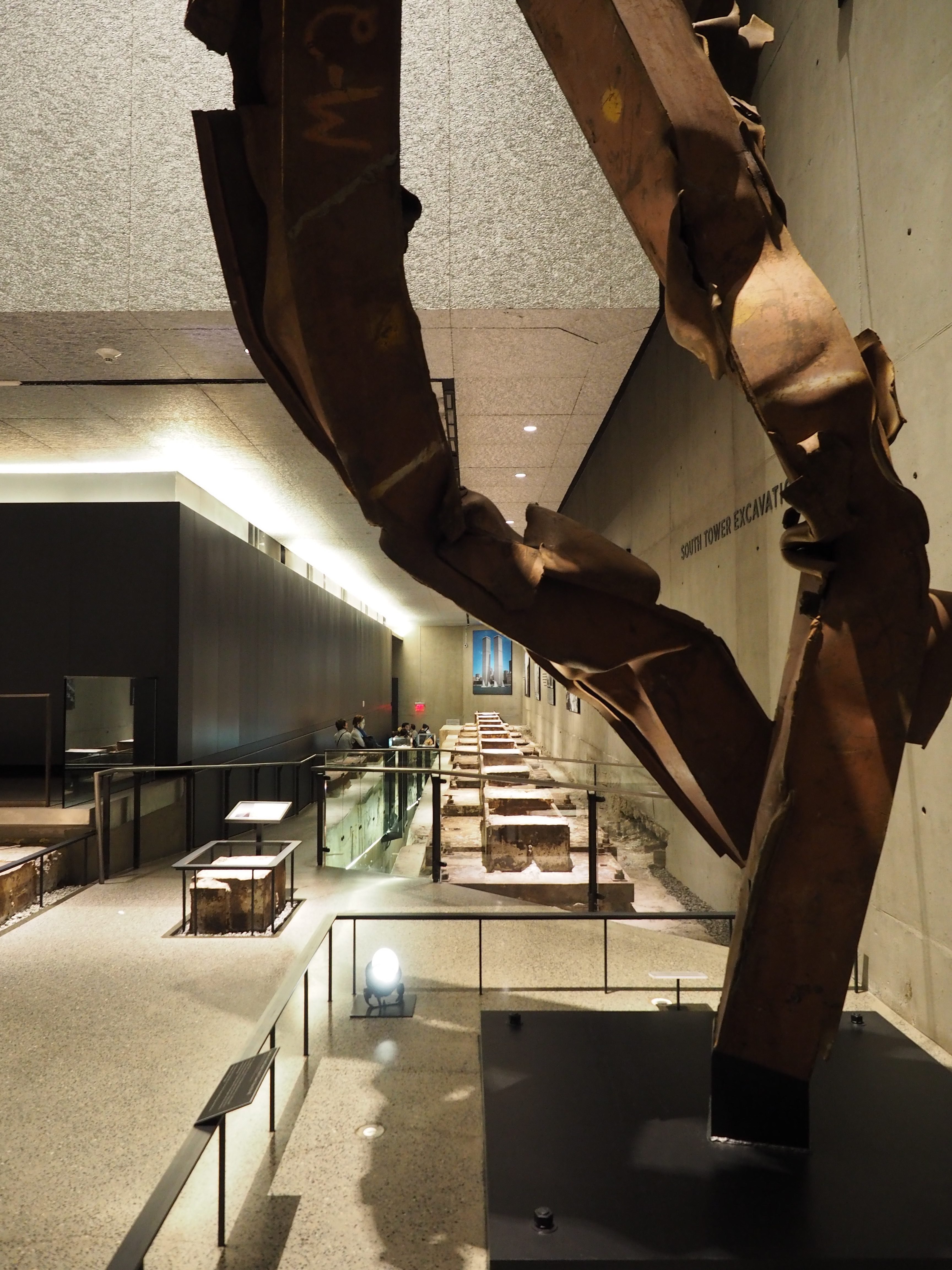 Die Wolkenkratzer decken sich wieder ein mit Wolken und wir beschließen ins nahgelegene Museum in die Tiefe zu steigen. 24$ kostet das, weswegen es bei vielen US-Amerikanern als wahrgenommene Touristenattraktion durchaus in der Kritik steht. Uns ist der Besuch das Geld wert. Der Gang nach unten ist durchaus wortwörtlich gemeint, da wir im Innern auf Fundament-Niveau am World Trade Center und seinem tragischen Schicksal vorbeigeführt werden. Natürlich sind wir uns um der Bedeutsamkeit dieses Ortes sehr bewusst insbesondere für die in diesem Land geborenen Menschen, dennoch befürchtete zumindest ich, dass es vielleicht als ein Art Ausstellung mit Entertainment-Wert konzipiert sein könnte.